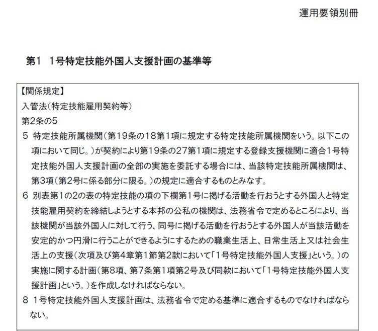 別表第1の2の表の特定技能の項の下欄第1号に掲げる活動を行おうとする外国人と特定技能雇用契約を締結しようとする本邦の公私の機関は、法務省令で定めるところにより、当該機関が当該外国人に対して行う、同号に掲げる活動を行おうとする外国人が当該活動を安定的かつ円滑に行うことができるようにするための職業生活上、日常生活上又は社会生活上の支援(次項及び第4章第1節第2款において「1号特定技能外国人支援」という。)の実施に関する計画(第8項、第7条第1項第2号及び同款において「1号特定技能外国人支援計画」という。)を作成しなければならない。