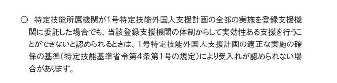 特定技能所属機関(第19条の18第1項に規定する特定技能所属機関をいう。以下この項において同じ。)が契約により第19条の27第1項に規定する登録支援機関に適合1号特定技能外国人支援計画の全部の実施を委託する場合には、当該特定技能所属機関は、第3項(第2号に係る部分に限る。)の規定に適合するものとみなす。