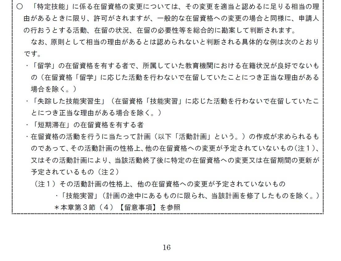 ・在留資格の活動を行うに当たって計画(以下「活動計画」という。)の作成が求められるものであって、その活動計画の性格上、他の在留資格への変更が予定されていないもの(注1)、又はその活動計画により、当該活動終了後に特定の在留資格への変更又は在留期間の更新が予定されているもの(注2)