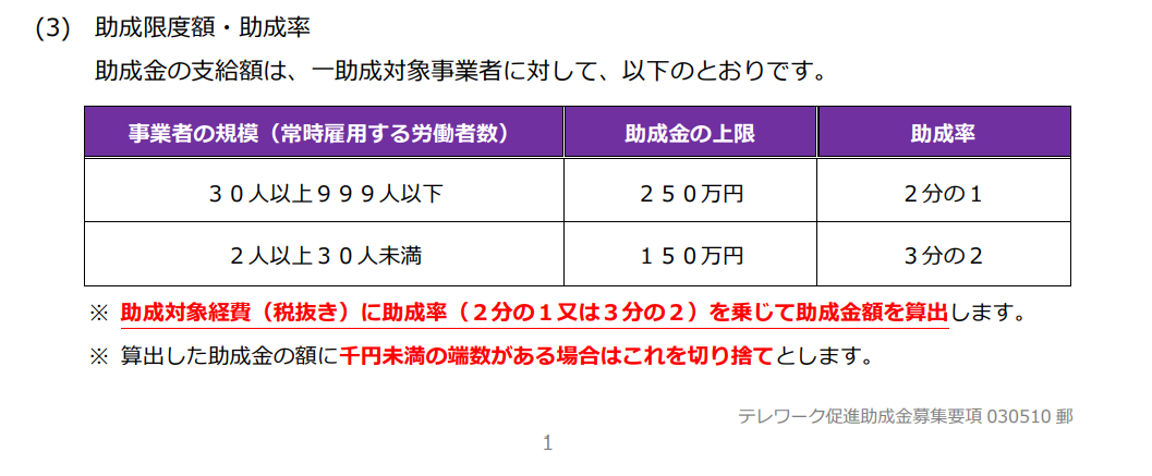 となると…、テレワーク実施者を20人くらい予定していなければ、上限額の150万円までなかなか到達しない概算になります。