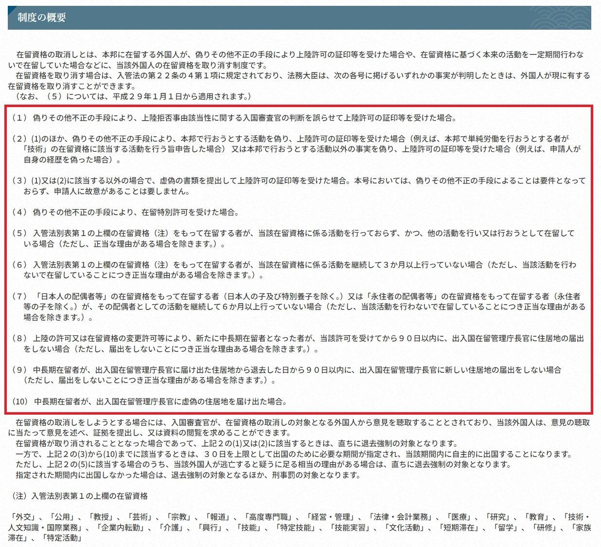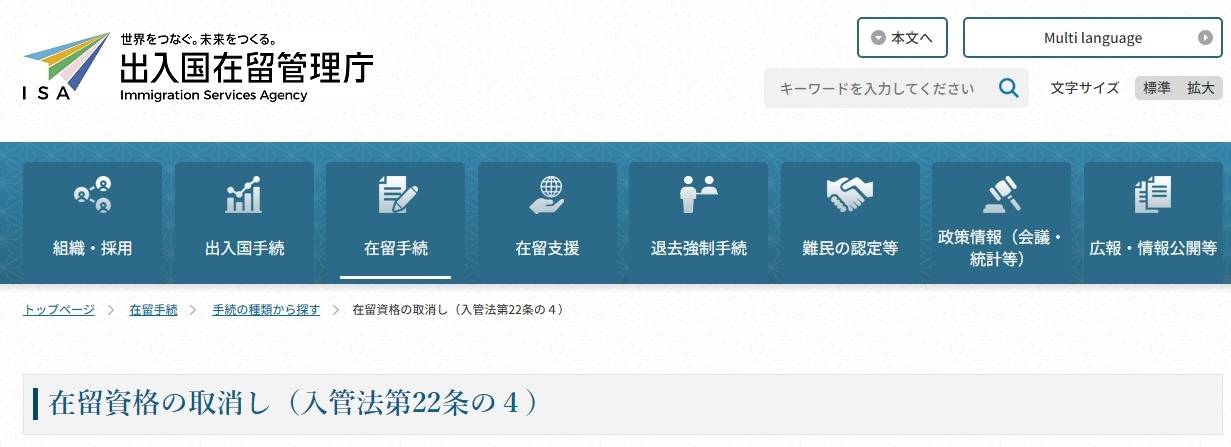 が、定められている在留資格(ビザ)の取消事由になります。