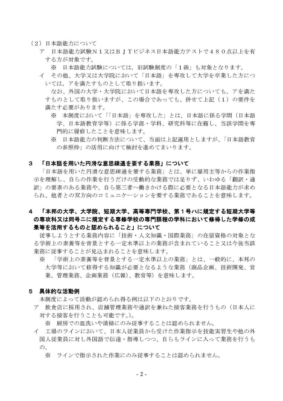 ※ 「学術上の素養等を背景とする一定水準以上の業務」とは、一般的に、本邦の大学等において修得する知識が必要となるような業務(商品企画、技術開発、営業、管理業務、企画業務(広報)、教育等)を意味します。