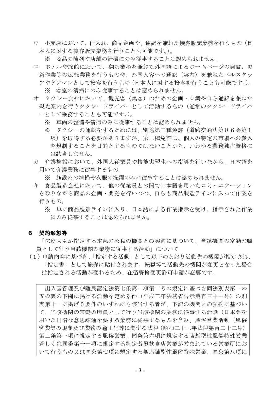 エ ホテルや旅館において、翻訳業務を兼ねた外国語によるホームページの開設、更新作業等の広報業務を行うものや、外国人客への通訳(案内)を兼ねたベルスタッフやドアマンとして接客を行うもの(日本人に対する接客を行うことも可能です。)。