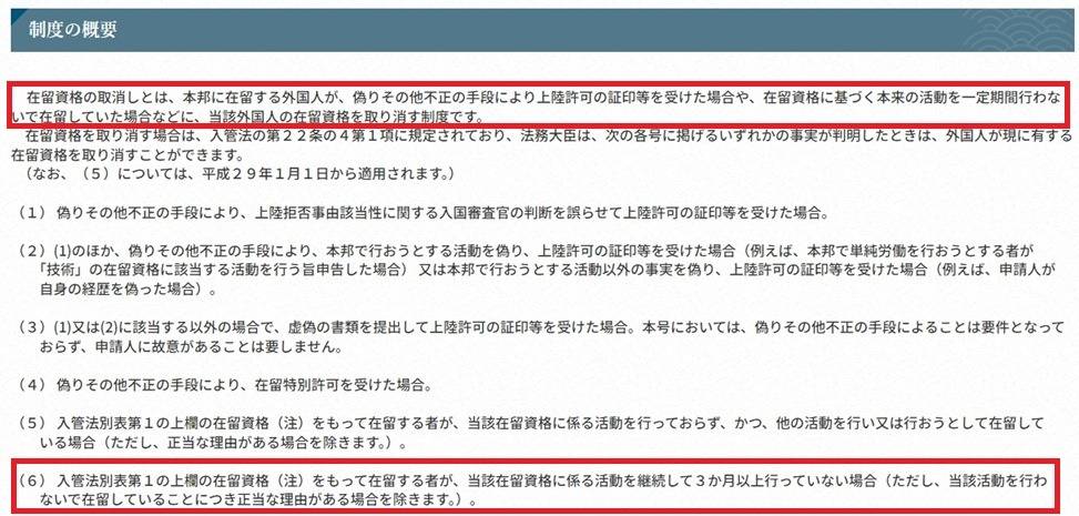 入管法別表第1の上欄の在留資格をもって在留する者が、当該在留資格に係る活動を継続して『3か月』以上行っていない場合(ただし、当該活動を行わないで在留していることにつき正当な理由がある場合を除きます。)。