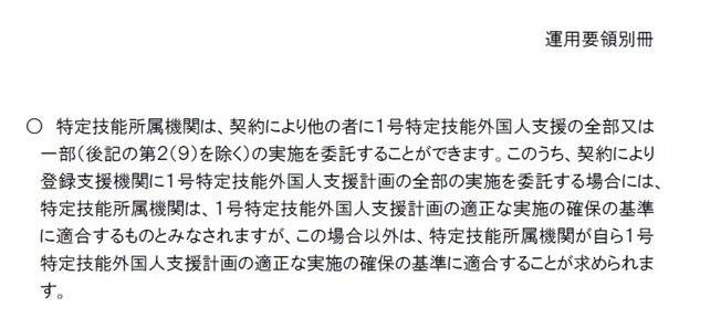 特定技能所属機関(第19条の18第1項に規定する特定技能所属機関をいう。以下この項において同じ。)が契約により第19条の27第1項に規定する登録支援機関に適合1号特定技能外国人支援計画の全部の実施を委託する場合には、当該特定技能所属機関は、第3項(第2号に係る部分に限る。)の規定に適合するものとみなす。