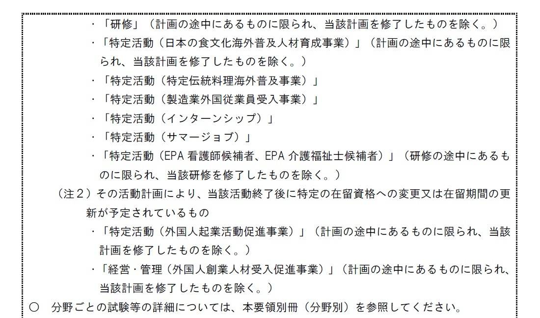 ・在留資格の活動を行うに当たって計画(以下「活動計画」という。)の作成が求められるものであって、その活動計画の性格上、他の在留資格への変更が予定されていないもの(注1)、又はその活動計画により、当該活動終了後に特定の在留資格への変更又は在留期間の更新が予定されているもの(注2)